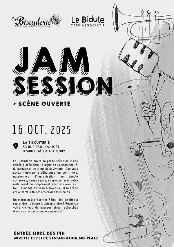 La Biscuiterie - en association avec Le Bidule, café associatif de Nogent l'Artaud - ouvre régulièrement sa scène aux musicien·ne·s de tous horizons lors de soirées jam sessions et scènes ouvertes. Ces rendez-vous conviviaux sont l’occasion de partager, d’improviser, d’explorer ensemble la richesse de la musique vivante, dans une ambiance chaleureuse et sans prétention. Que vous soyez musicien·ne confirmé·e, amateur·rice passionné·e ou simple spectateur·rice curieux·se, ces soirées sont ouvertes à toutes et tous. Venez avec votre instrument… ou simplement avec vos oreilles ! L’entrée est libre, et la buvette comme la petite restauration sont de la partie pour accompagner la soirée.